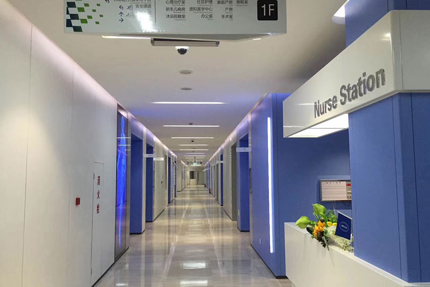 北京曹妃甸國際職教城,位于唐山市曹妃甸。學校培養定向入職學院,所以現場是以醫院實際操作為基礎,包括各種儀器、醫療設備都已進場,在此學習的學生該享福了,條件可以稱得上高大上;設計師在整體風格上總共運用了5種顏色,這種做法使現場的分區特別到位,先看看走廊的圖片:在所有的病房、科室門口都用福爾卡金屬拉絲抗倍特鑲嵌顯示屏的處理,防火板彎曲門板外設計了埡口,將病房、防火門、管井門等進行了隱藏,站在走廊中間這...
